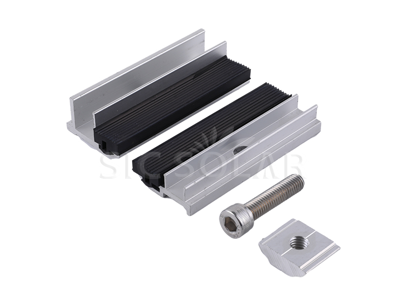 braçadeira final para painel solar de película fina Pode ser usado para diversos tipos de módulos solares de película fina ou módulos solares de vidro sem moldura. A borracha no meio protege bem os painéis solares de película fina. O material é alumínio extrudado anodizado 6005-T5, parafuso, borracha EPDM e fixadores de aço inoxidável. O material de alta qualidade e o design preciso garantem a fixação estável da película fina.